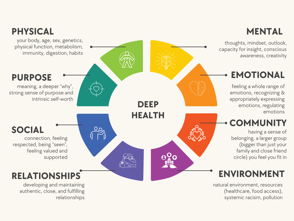 If you look at the graph above, our health is not just our physical being, but also our mental health, our emotions, our sense of purpose, our relationships, support and community, as well as the greater environment around us.