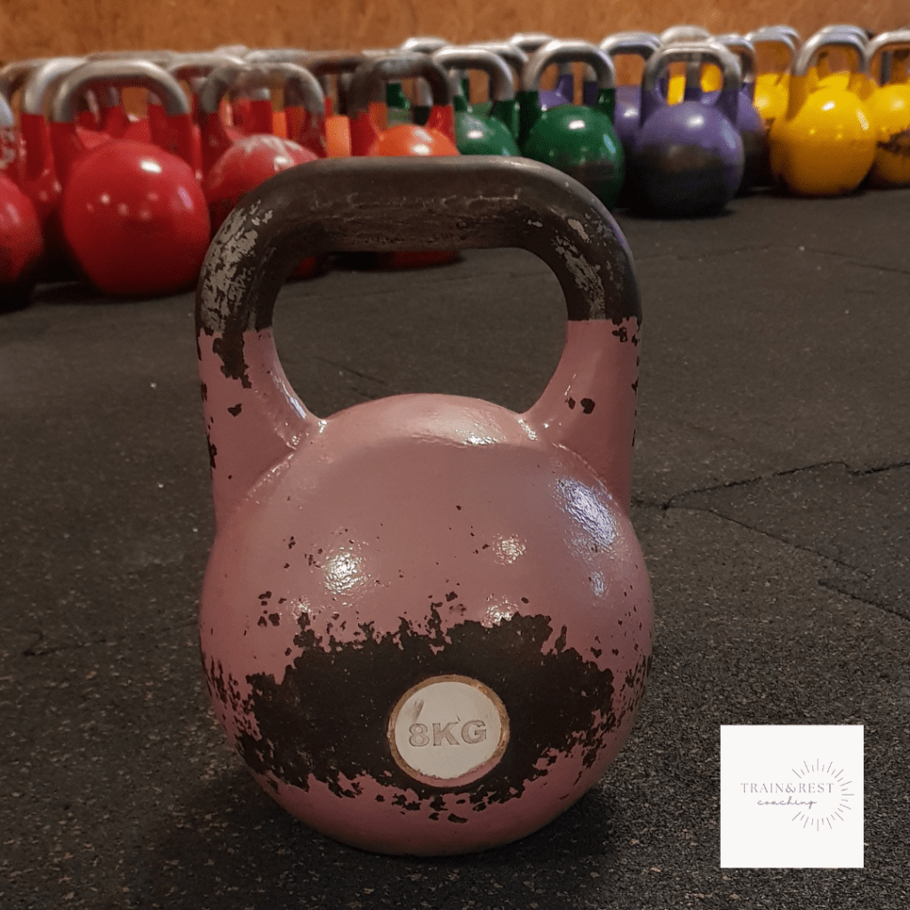 If you’re a woman and you’re just starting out, consider starting with 6 or 8 kg (15-20 lbs.). I generally do the below workout with a 10 kg (22 lbs.) competition kettlebell.