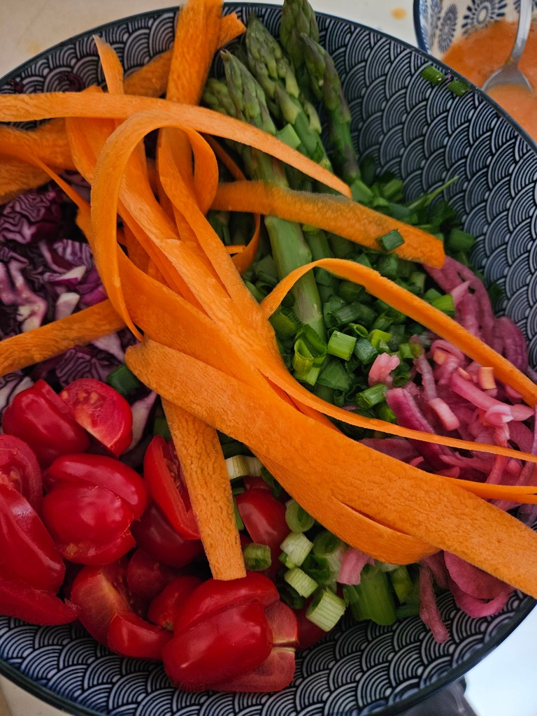 Don’t forget to include healthy fats like avocado, sesame seeds, nuts, or a splash of olive oil or flaxseed oil for satiety and flavor.